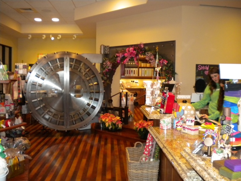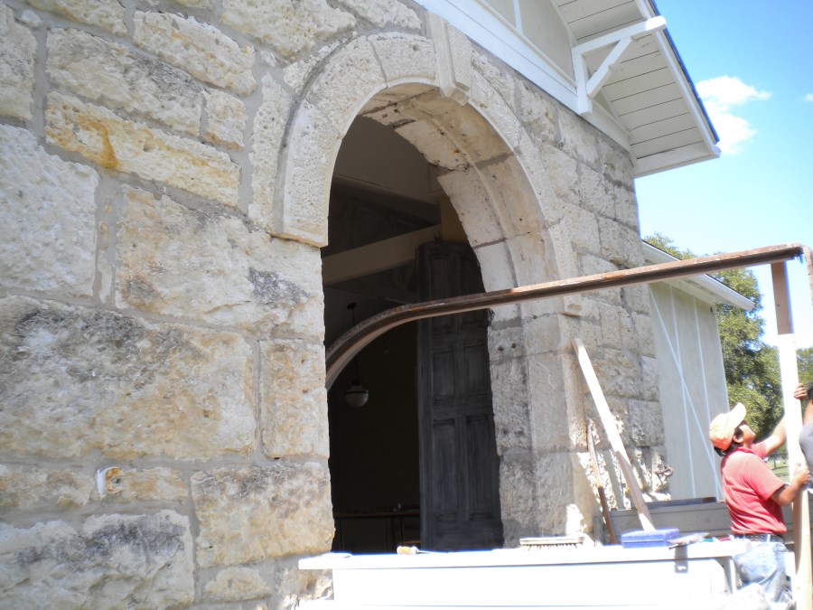We were asked to remove the door frames, doors & trim and re-install them so that they would swing out. Since the stone blocks that make up the exterior wall were 24″ wide we had to custom build a 12″ wide door jamb to cover the raw stone on the inside of the building and faux paint it to match the old doors.